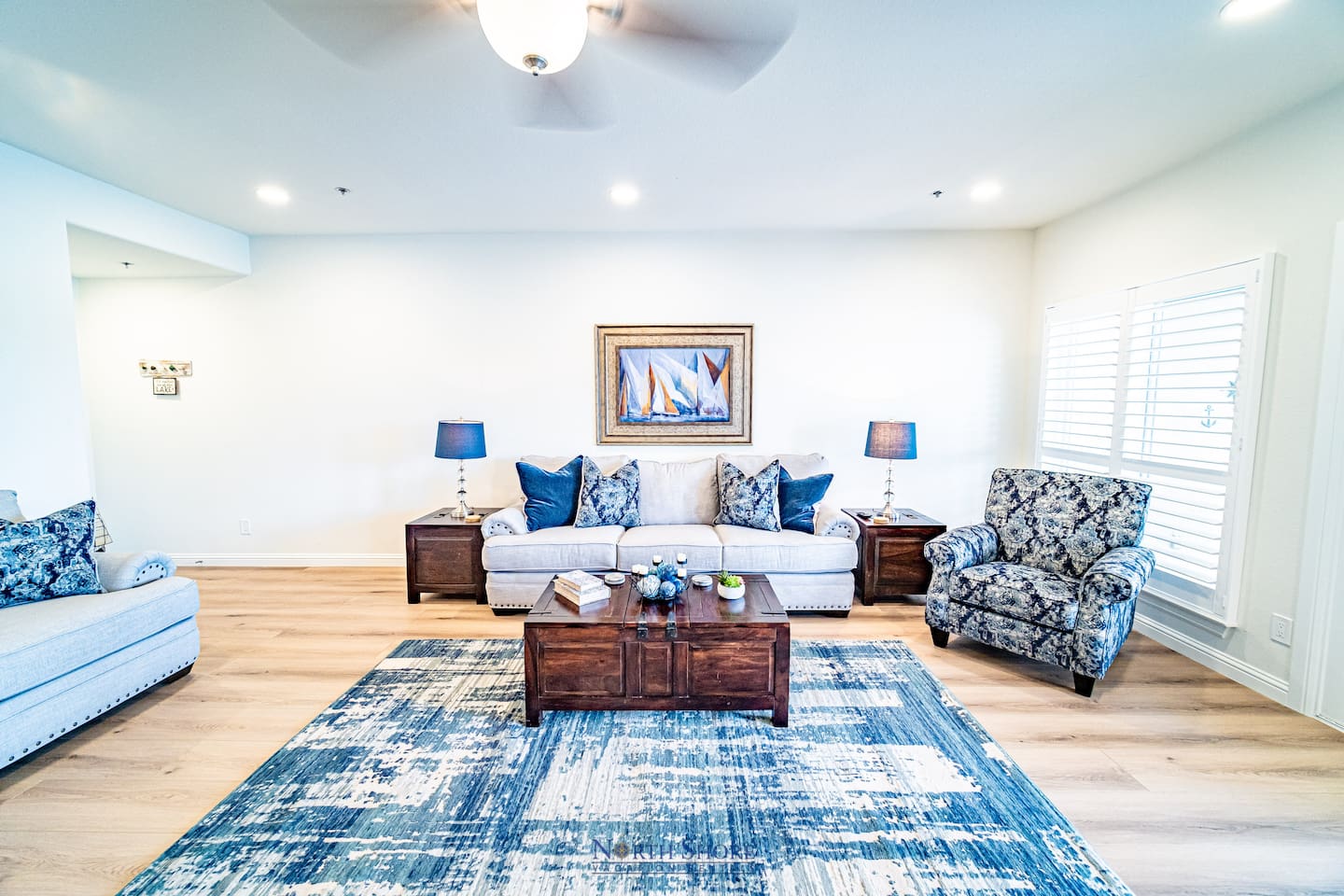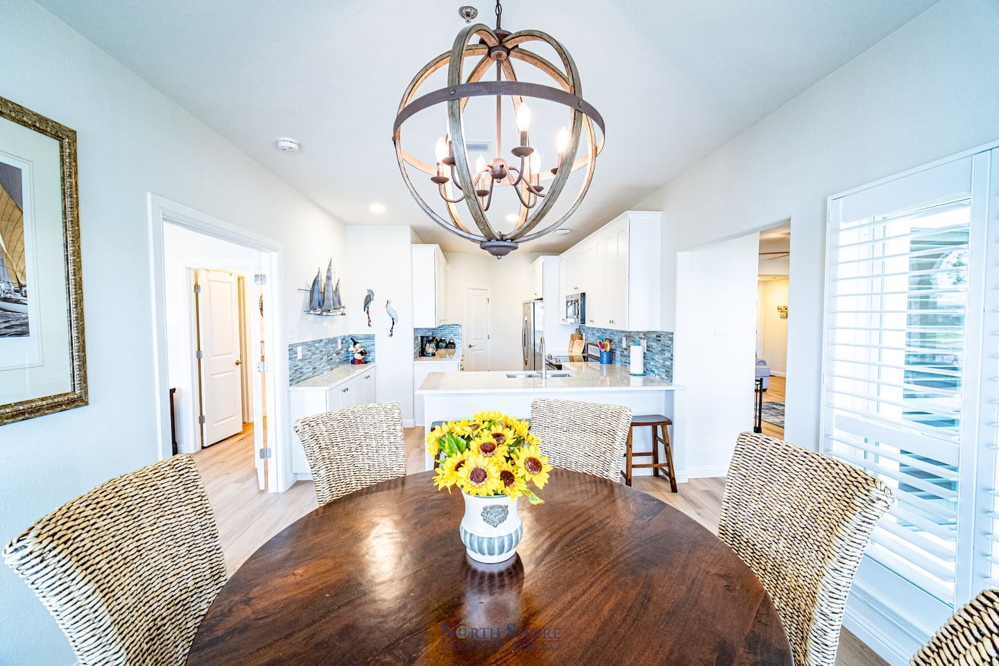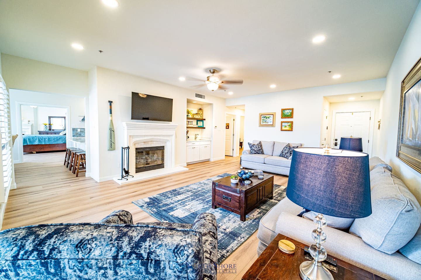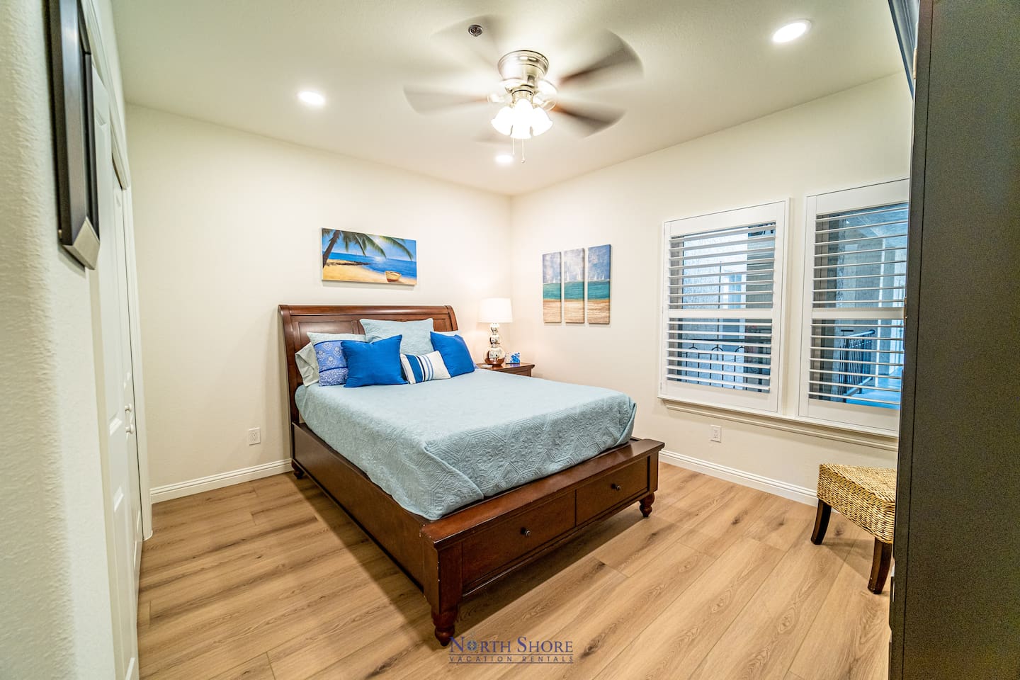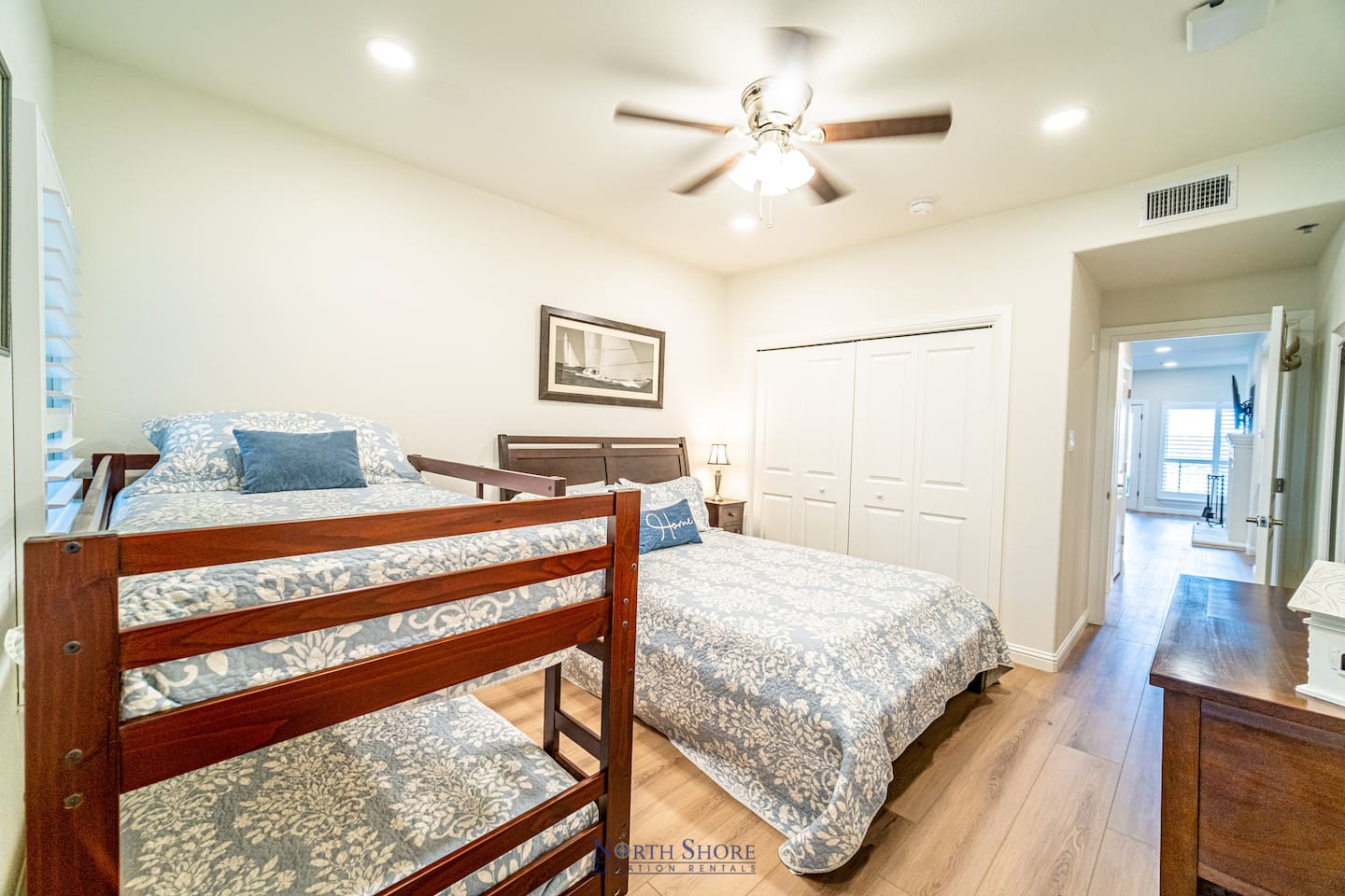 Down the villa hallway you'll find a utility room with full size washer/dryer and counter space, a second full bathroom with walk-in shower, and the additional two guest bedrooms. The second guest bedroom has a queen size bed and hardwood floors. The third bedroom has a queen bed and two bunk beds, HDTV, and hardwood floors.