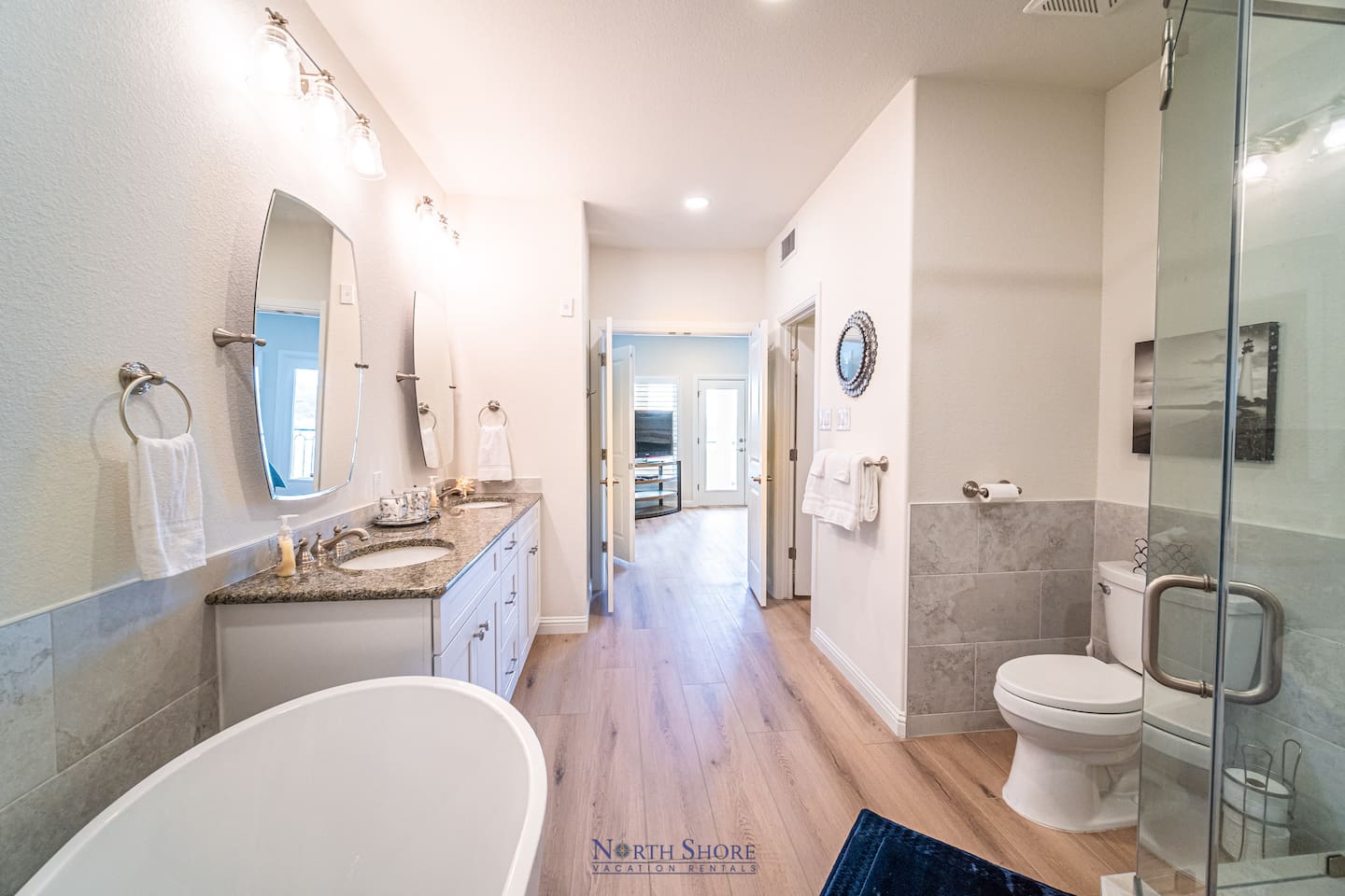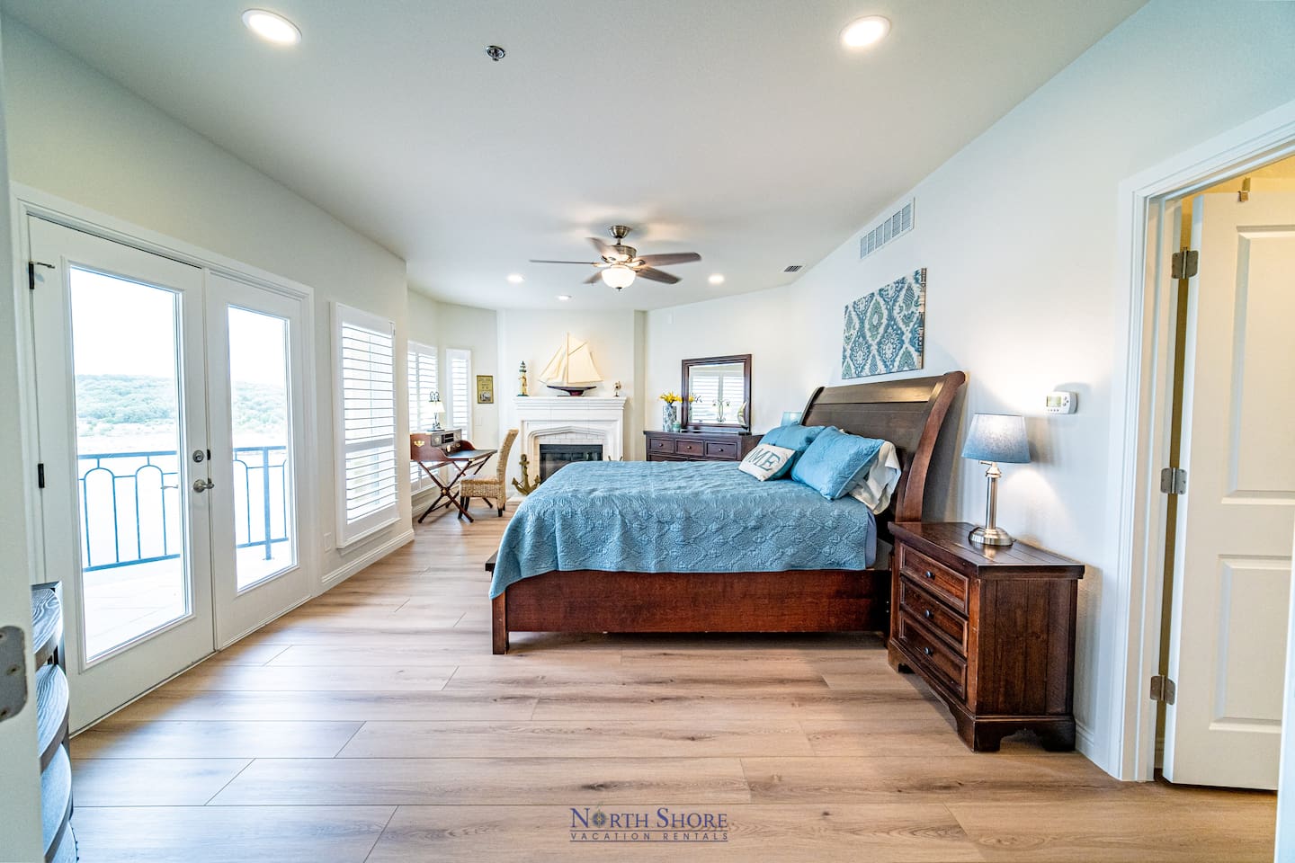 The large master bedroom suite is stunning and boasts french doors, hardwood floors,fireplace, king size bed, and study/reading nook. All, of course, with panoramic lake views and patio access.There is also a large, en suite bath with jetted tub, walk-in shower, double vanity, and oversized closet. This master retreat has wall-to-wall windows facing Lake Travis, patio access with bistro seating, and is truly a great place to relax and unwind.