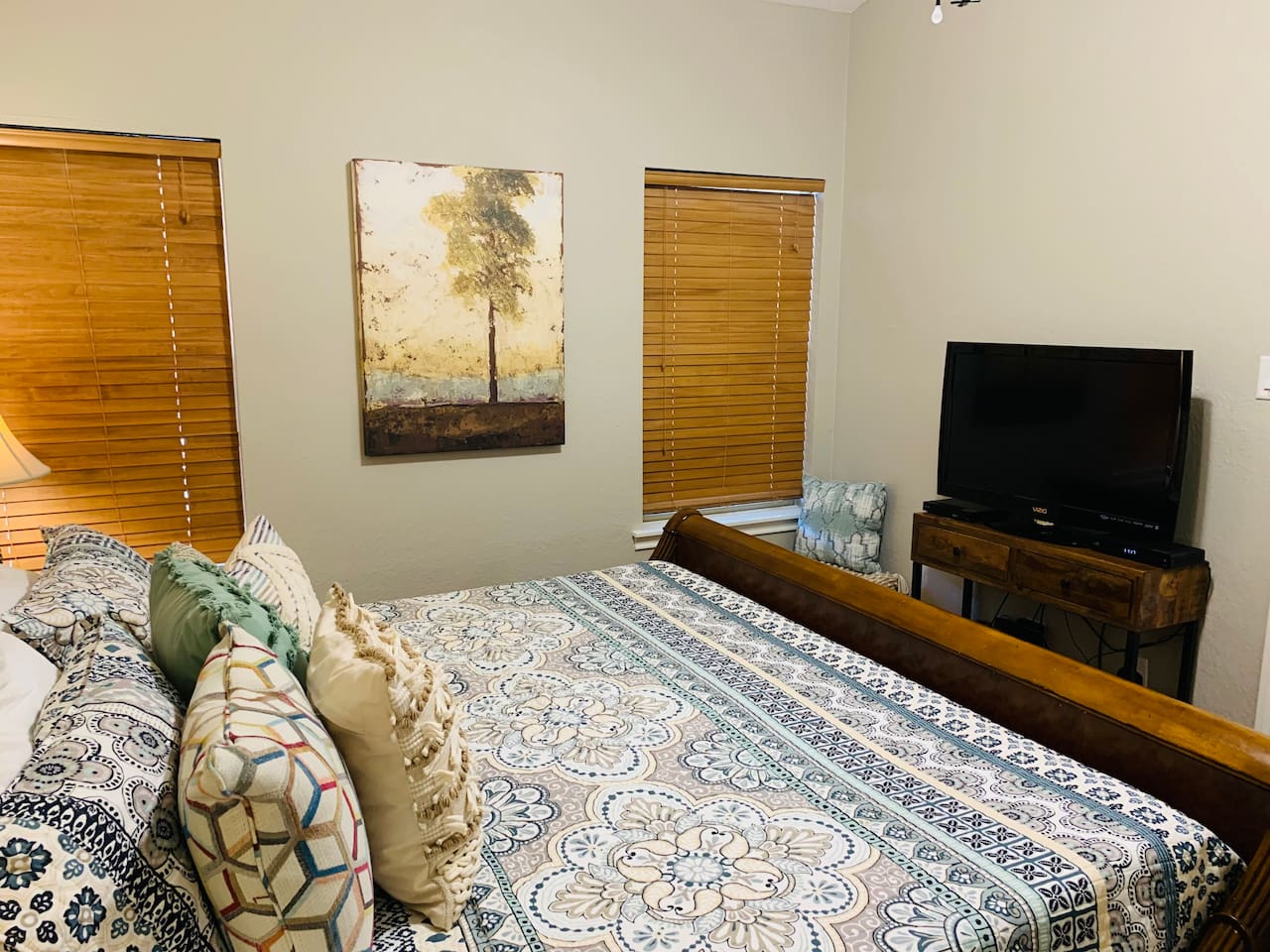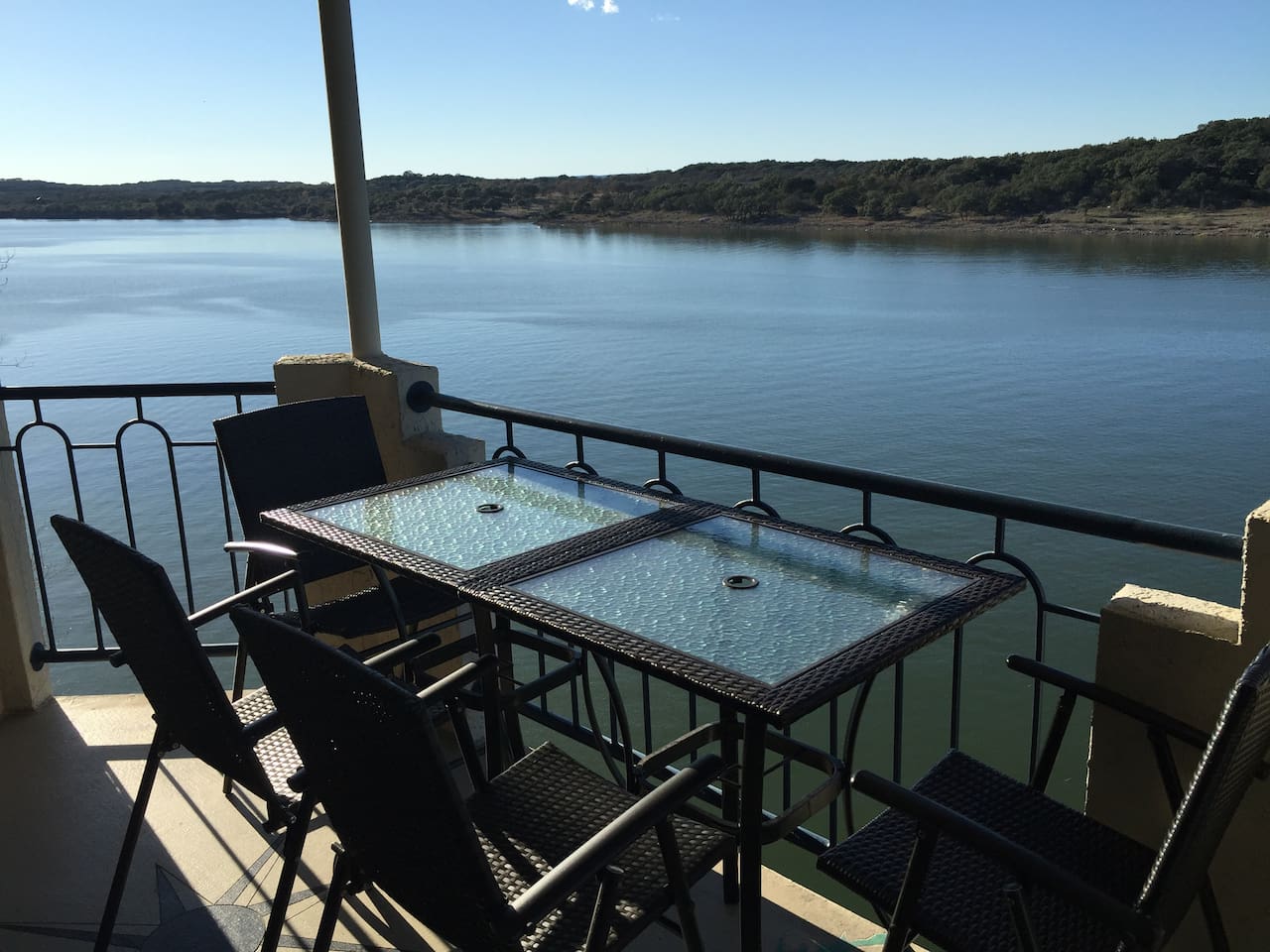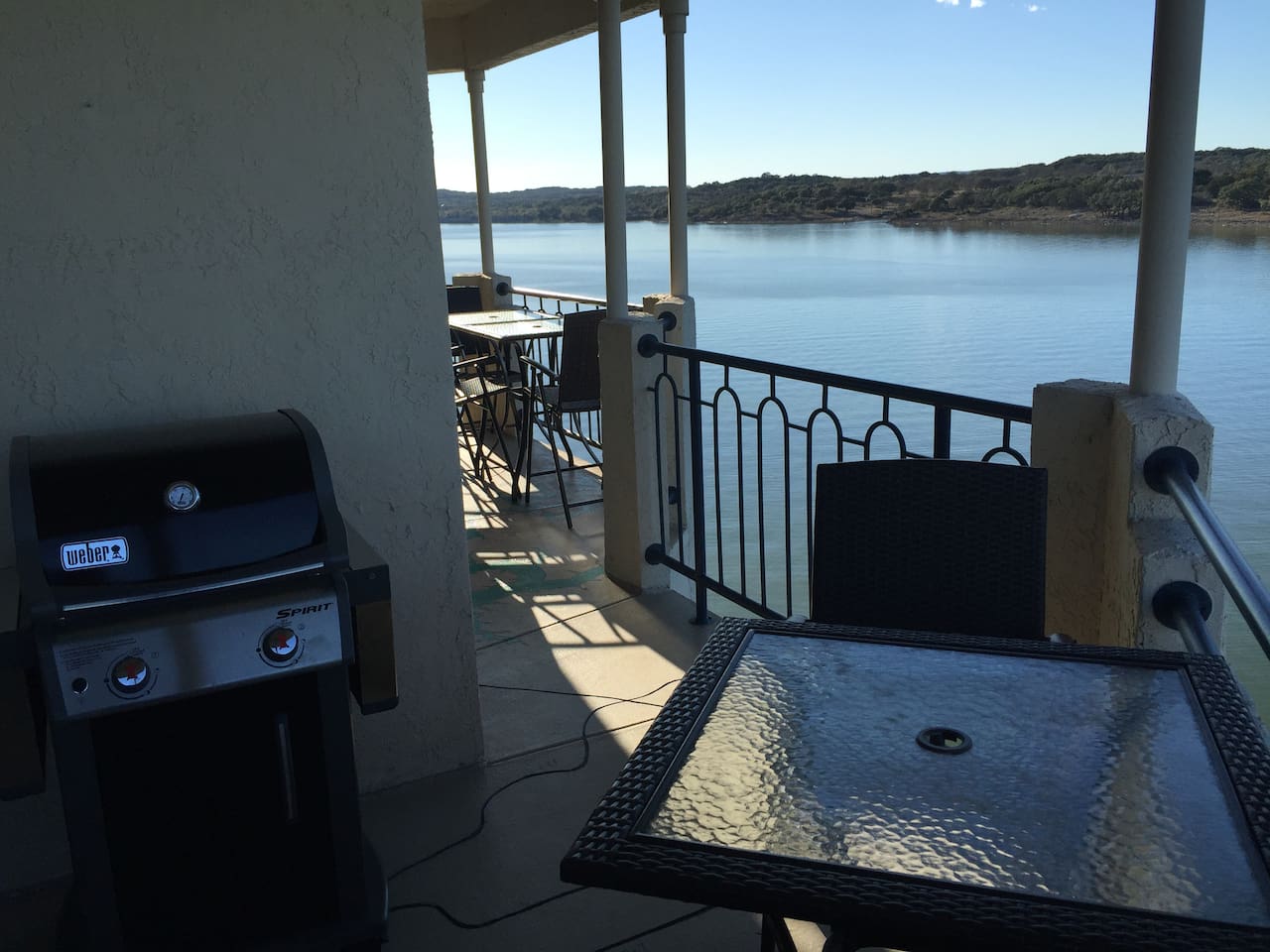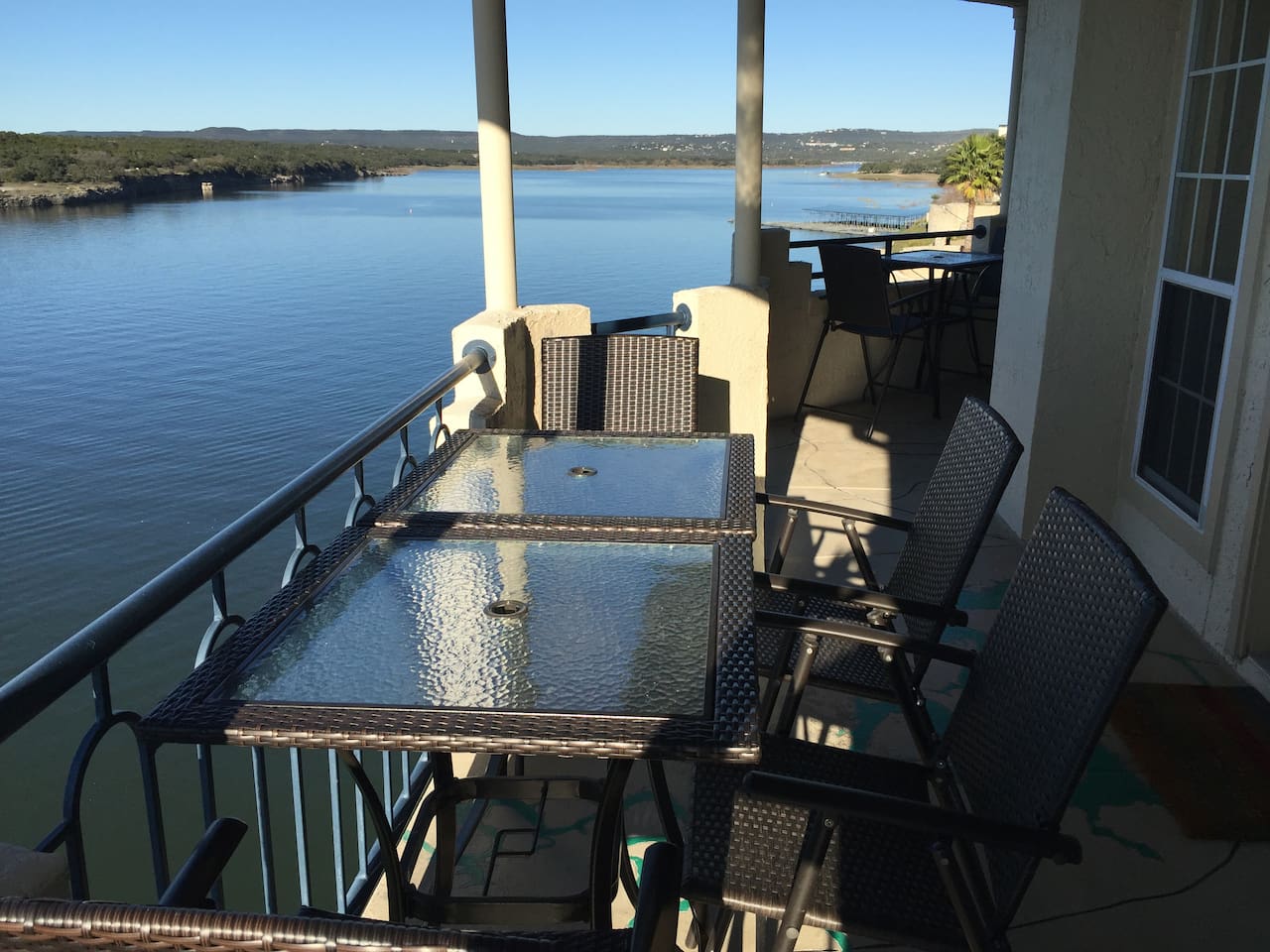 Relax on the patio and watch the sunset over the waters of Lake Travis from our lakefront villa at The Island on Lake Travis. Our 2 bedroom, 2 bath condo sleeps 6 people, has been fully remodeled in 2021 and offers unobstructed panoramic lake and hill country views from a top floor corner setting with all the comforts of home. The villa has a fully equipped kitchen, outdoor grill, fireplace, washer/dryer, open living/dining area with queen sleeper sofa, high speed WiFi, and 3 HDTVs with cable service and Blu-ray DVD players. There is also a Sound Bar in the living room that you can connect to by Bluetooth and play your favorite music. The master bedroom features a king size bed with large en suite bathroom that has a walk-in shower and Jacuzzi tub. It also has direct patio access with lakefront views. The guest bedroom has a spacious king size bed and an adjacent bathroom with walk-in shower.