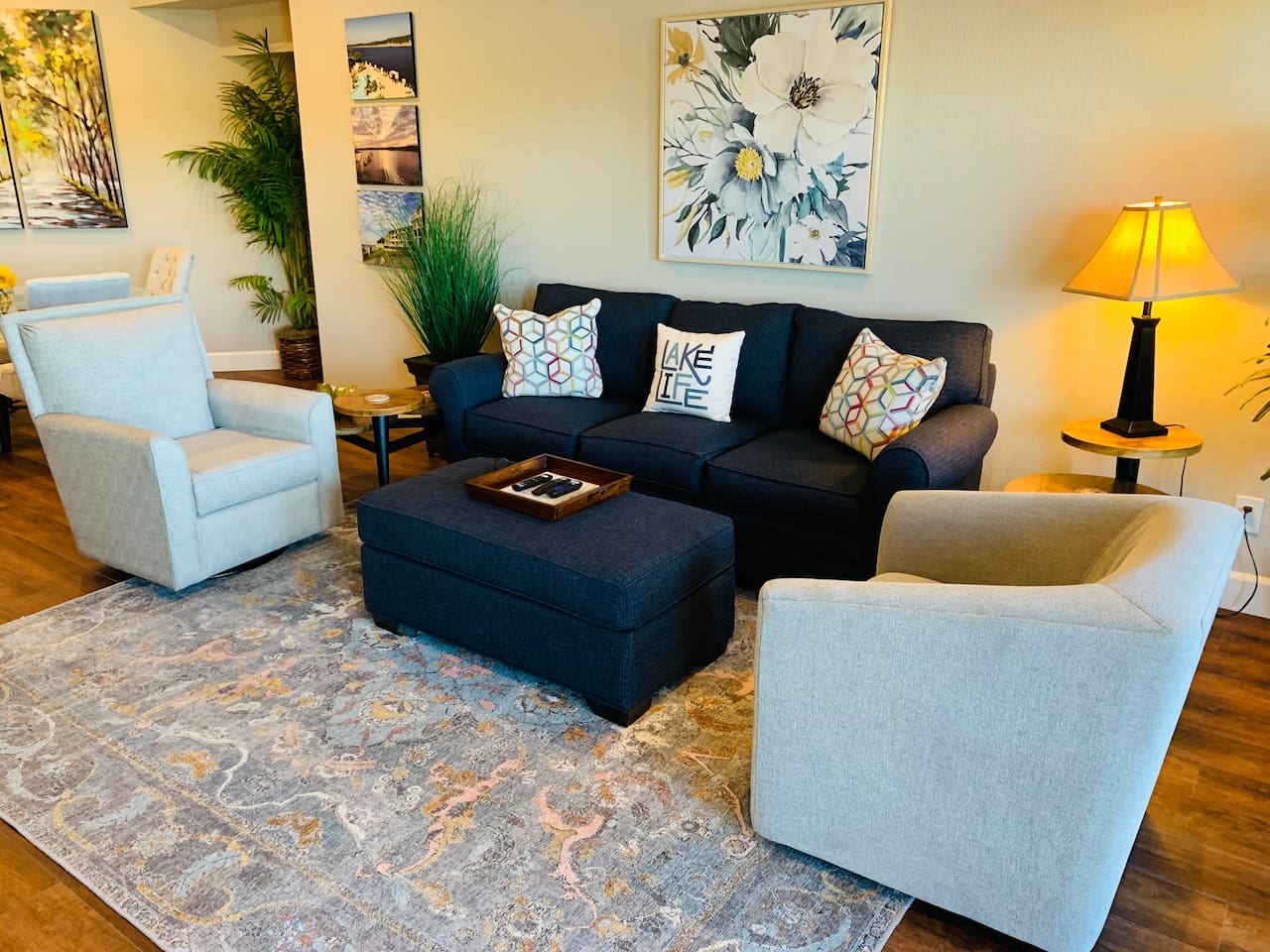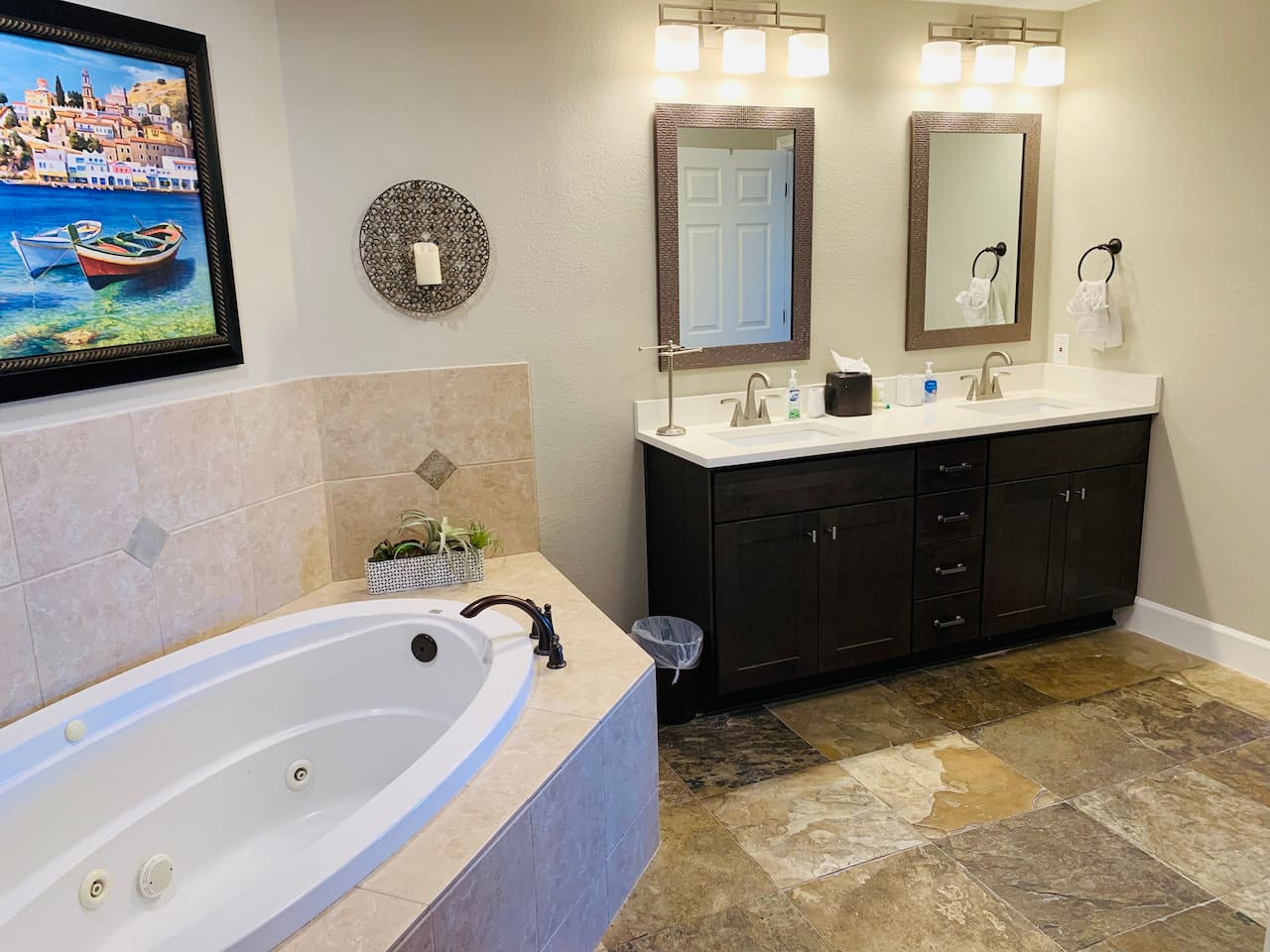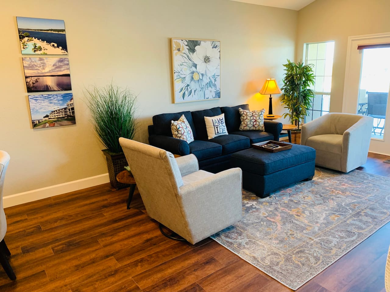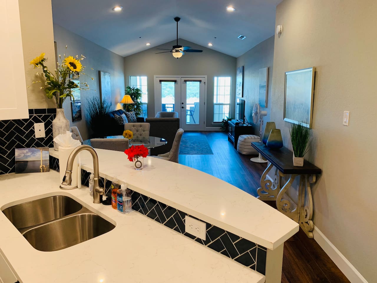 Relax on the patio and watch the sunset over the waters of Lake Travis from our lakefront villa at The Island on Lake Travis. Our 2 bedroom, 2 bath condo sleeps 6 people, has been fully remodeled in 2021 and offers unobstructed panoramic lake and hill country views from a top floor corner setting with all the comforts of home. The villa has a fully equipped kitchen, outdoor grill, fireplace, washer/dryer, open living/dining area with queen sleeper sofa, high speed WiFi, and 3 HDTVs with cable service and Blu-ray DVD players. There is also a Sound Bar in the living room that you can connect to by Bluetooth and play your favorite music. The master bedroom features a king size bed with large en suite bathroom that has a walk-in shower and Jacuzzi tub. It also has direct patio access with lakefront views. The guest bedroom has a spacious king size bed and an adjacent bathroom with walk-in shower.