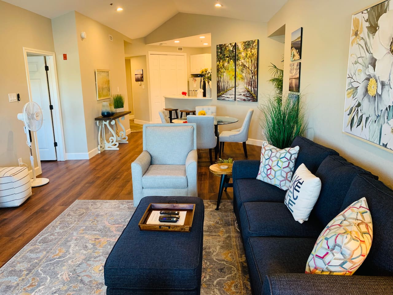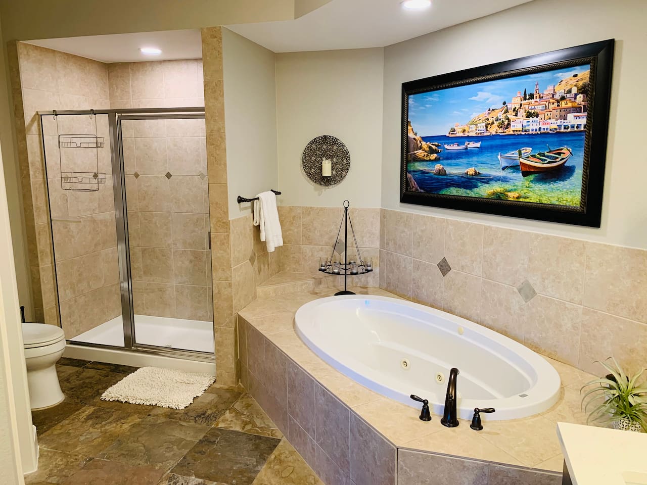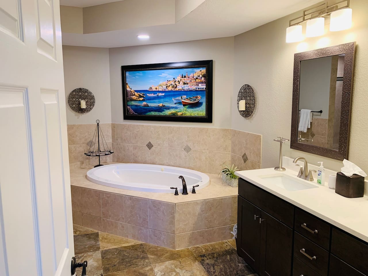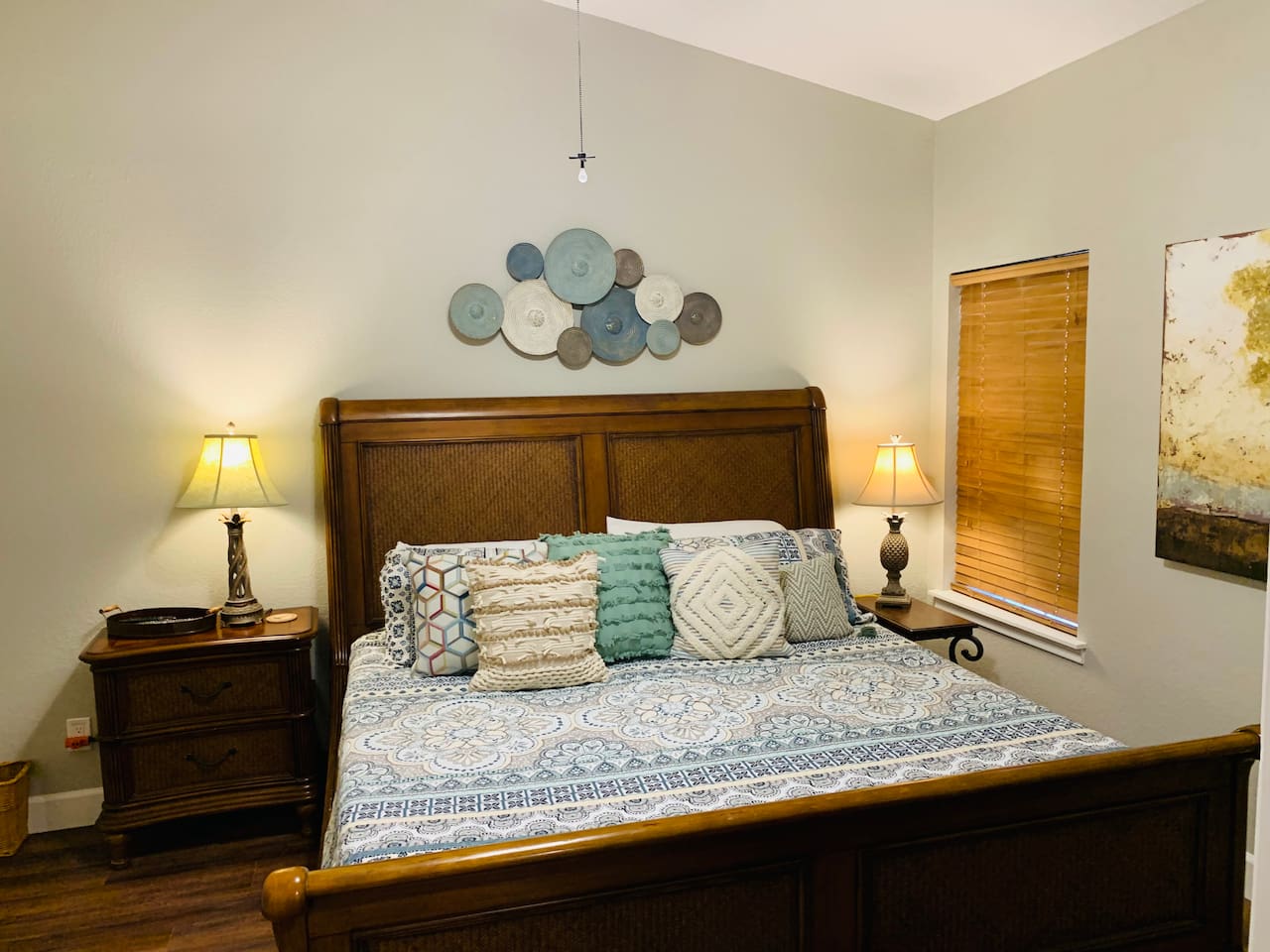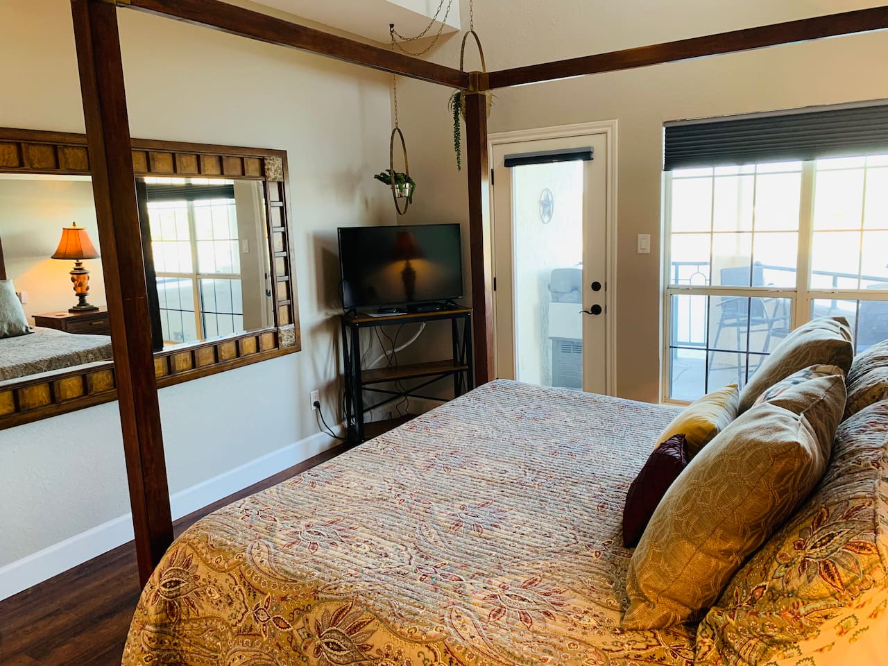 Relax on the patio and watch the sunset over the waters of Lake Travis from our lakefront villa at The Island on Lake Travis. Our 2 bedroom, 2 bath condo sleeps 6 people, has been fully remodeled in 2021 and offers unobstructed panoramic lake and hill country views from a top floor corner setting with all the comforts of home. The villa has a fully equipped kitchen, outdoor grill, fireplace, washer/dryer, open living/dining area with queen sleeper sofa, high speed WiFi, and 3 HDTVs with cable service and Blu-ray DVD players. There is also a Sound Bar in the living room that you can connect to by Bluetooth and play your favorite music. The master bedroom features a king size bed with large en suite bathroom that has a walk-in shower and Jacuzzi tub. It also has direct patio access with lakefront views. The guest bedroom has a spacious king size bed and an adjacent bathroom with walk-in shower.