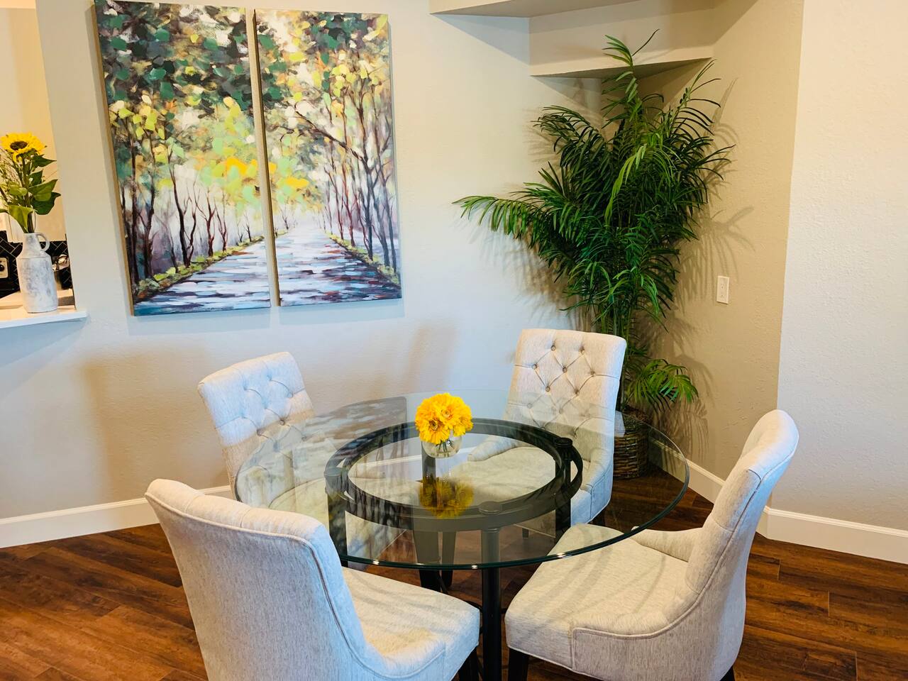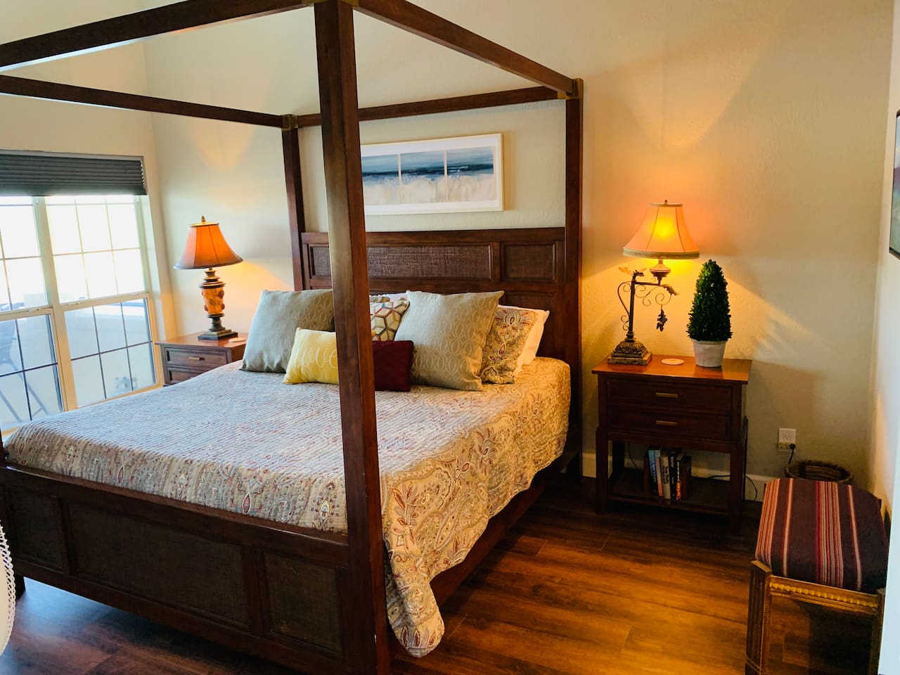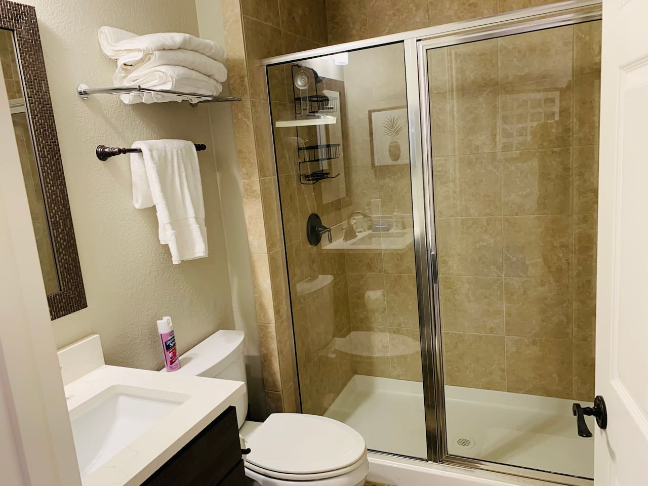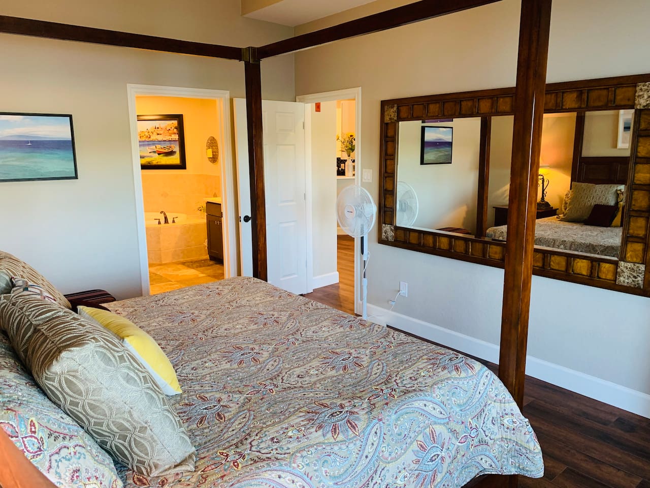 Relax on the patio and watch the sunset over the waters of Lake Travis from our lakefront villa at The Island on Lake Travis. Our 2 bedroom, 2 bath condo sleeps 6 people, has been fully remodeled in 2021 and offers unobstructed panoramic lake and hill country views from a top floor corner setting with all the comforts of home. The villa has a fully equipped kitchen, outdoor grill, fireplace, washer/dryer, open living/dining area with queen sleeper sofa, high speed WiFi, and 3 HDTVs with cable service and Blu-ray DVD players. There is also a Sound Bar in the living room that you can connect to by Bluetooth and play your favorite music. The master bedroom features a king size bed with large en suite bathroom that has a walk-in shower and Jacuzzi tub. It also has direct patio access with lakefront views. The guest bedroom has a spacious king size bed and an adjacent bathroom with walk-in shower.
