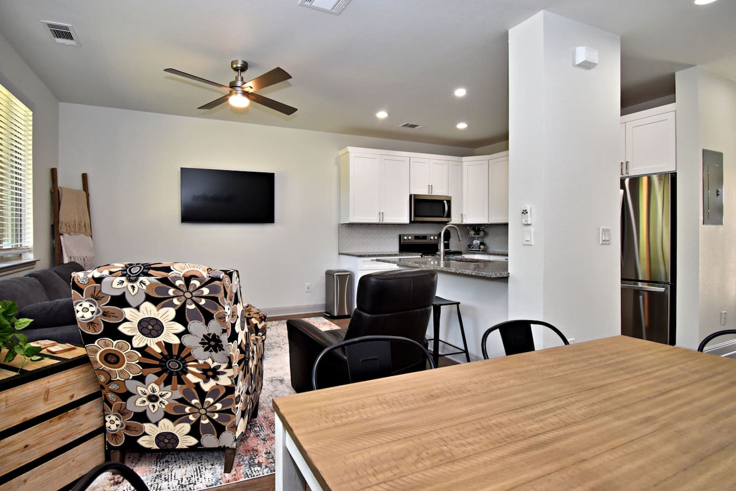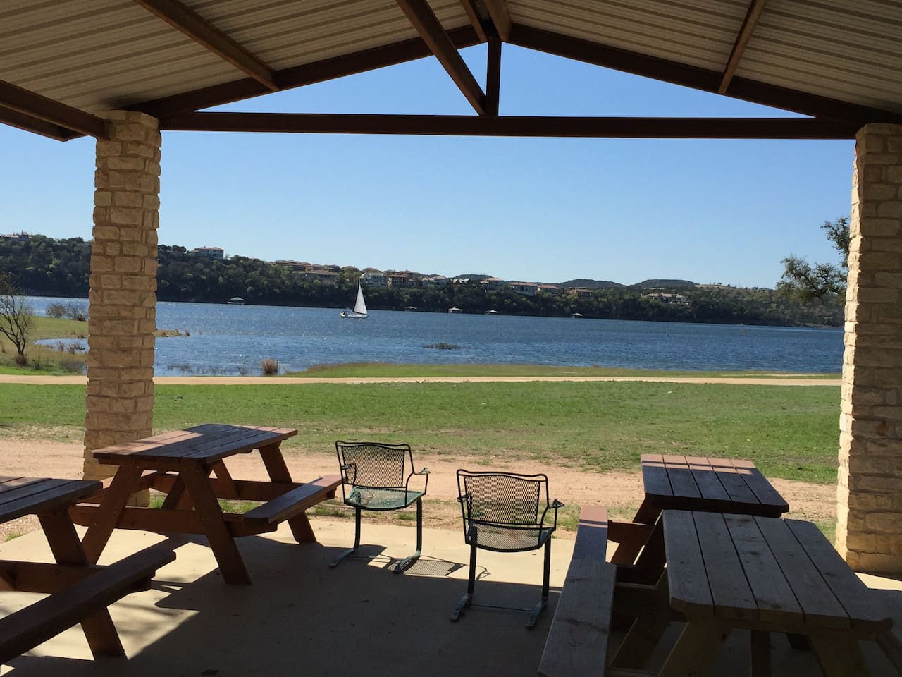 Tucked away in the secluded hill country setting of Point Venture, is our quaint Villa with access to all the resort amenities including pool, golf, tennis, lakefront park, and year round restaurant. The Villa sleeps up to 7 guests and has 3 bedrooms and 2 1/2 baths. There are two queen beds, and one twin over full bunk beds. All bedrooms have Smart TVs and there is patio access from the master bedroom and an en-suite bath with walk-in shower.