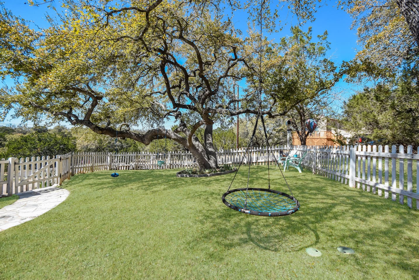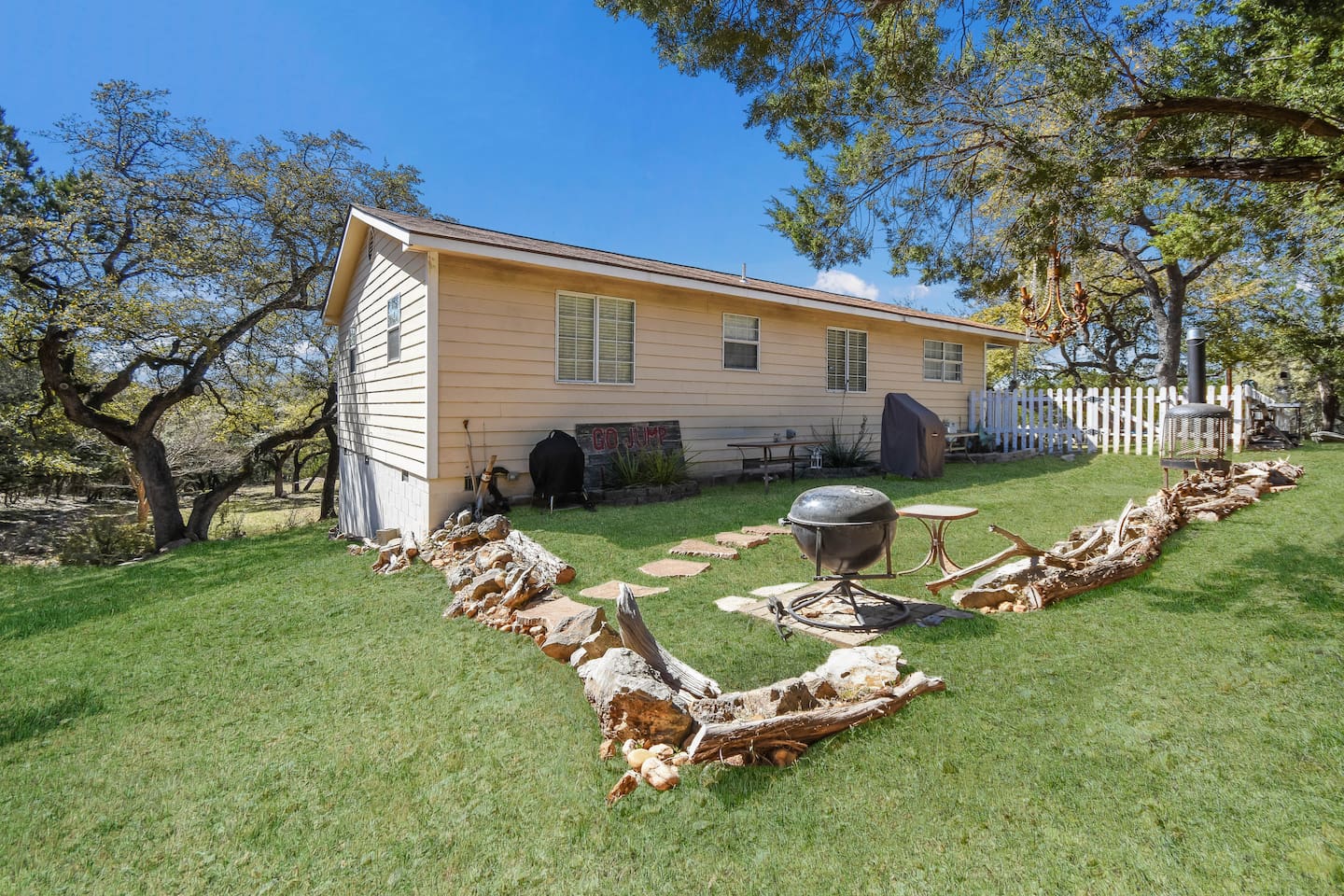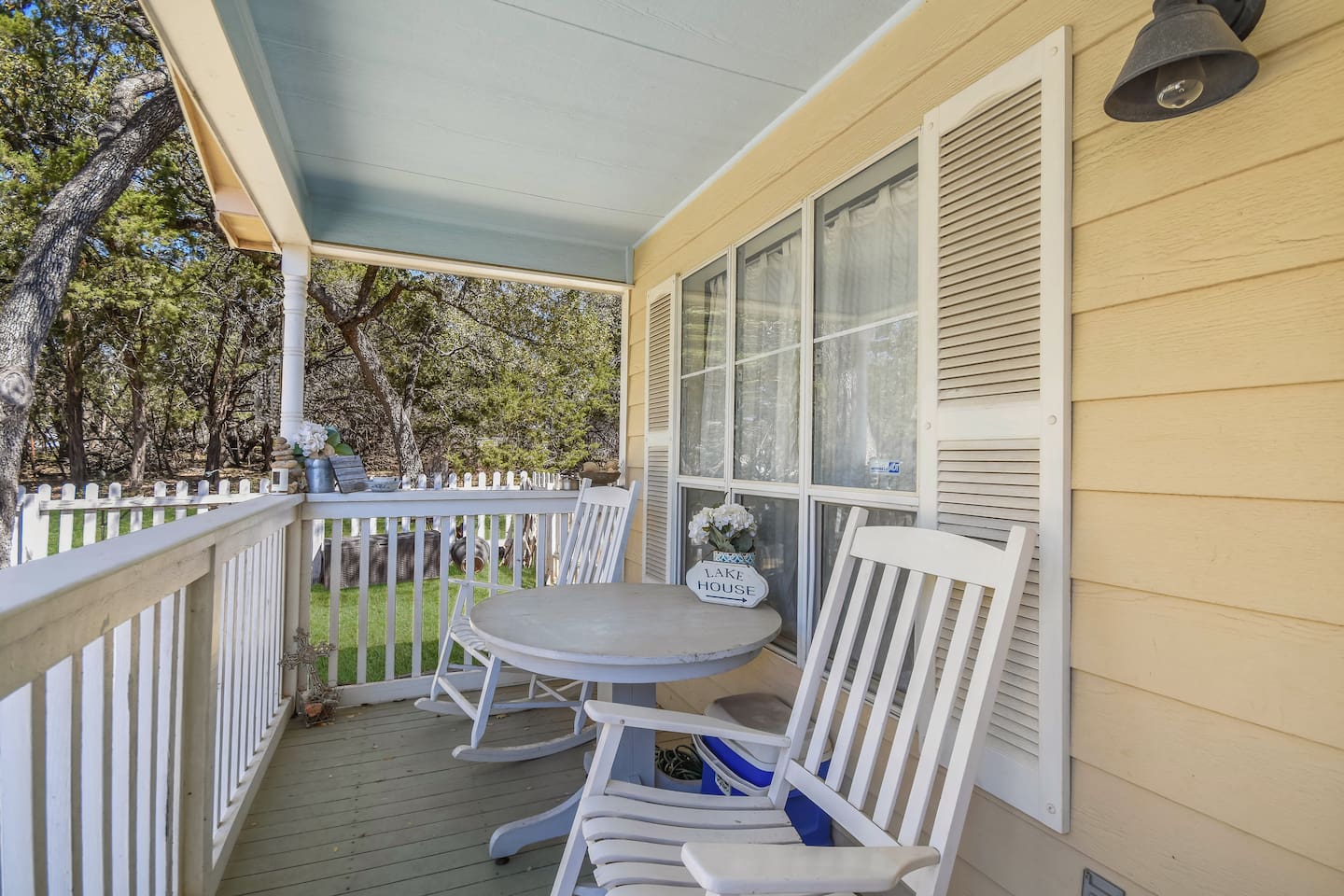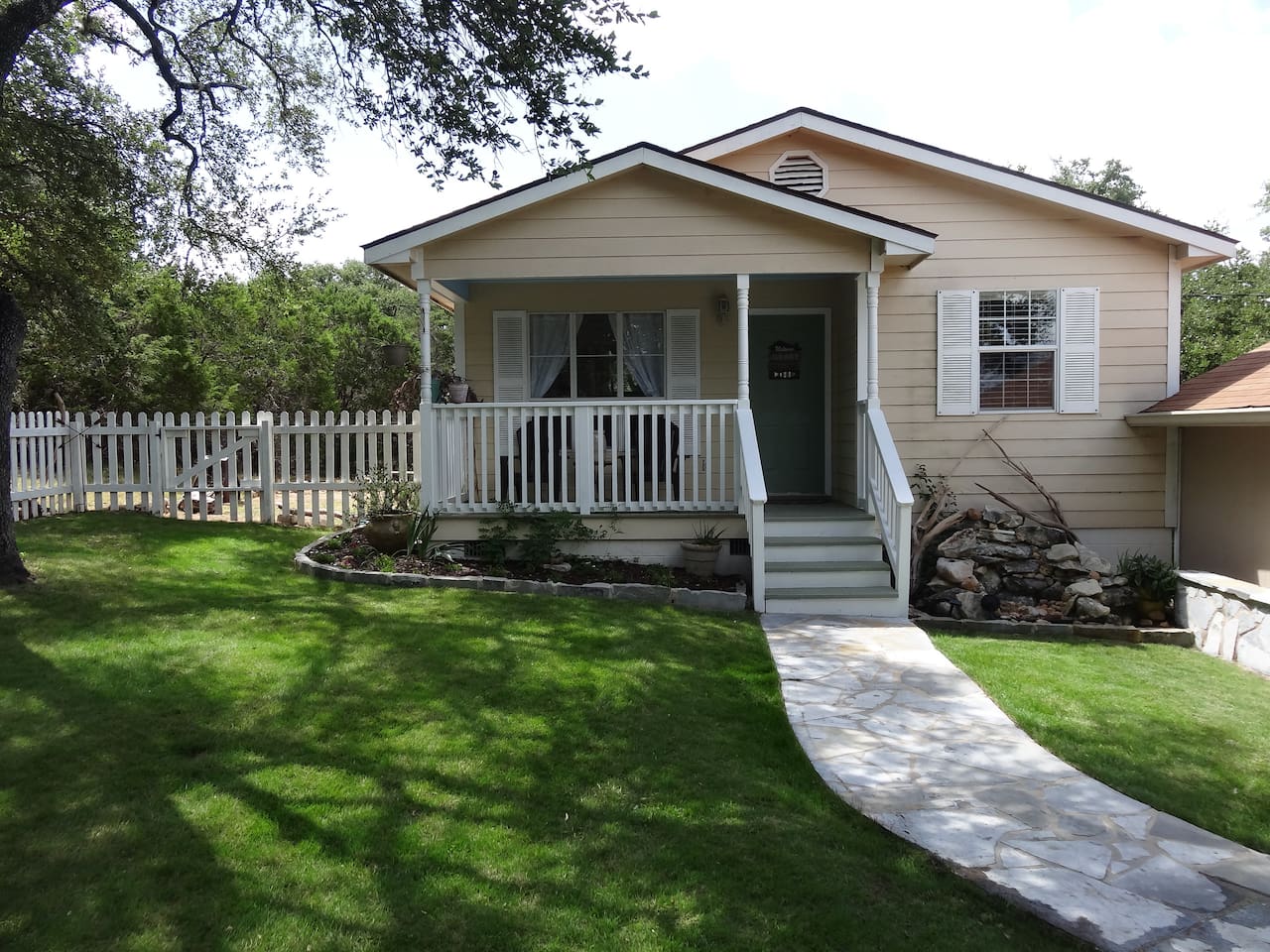 Tucked away in a quiet, wooded cul-de-sac amongst towering oaks in the Texas Hill Country, is our Lazy Lakehouse. Centrally located in Lago Vista and only a 2 – 5 minute drive to lakefront parks, pool, fitness, marina, golf, and Lake Travis access. Our cottage has 3 bedrooms, 2 baths, sleeps 6, and has a white picket fenced yard that's shaded and great for children, pets, games, and all around family fun. Feed the deer, relax on the porch, and create lasting memories with family and friends!