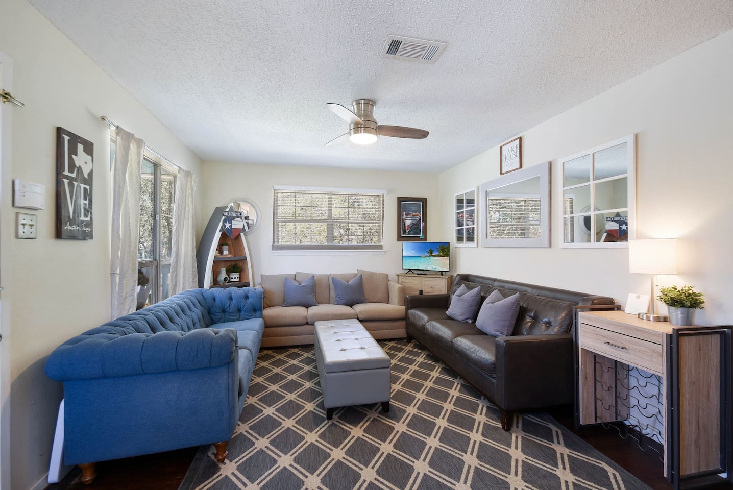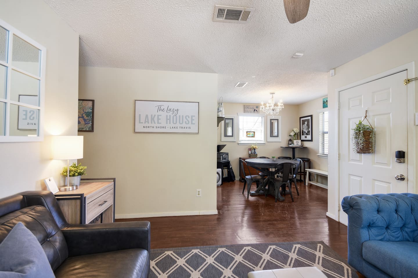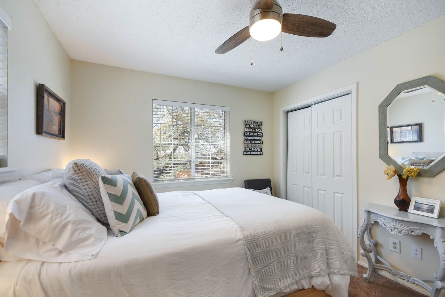 Tucked away in a quiet, wooded cul-de-sac amongst towering oaks in the Texas Hill Country, is our Lazy Lakehouse. Centrally located in Lago Vista and only a 2 – 5 minute drive to lakefront parks, pool, fitness, marina, golf, and Lake Travis access. Our cottage has 3 bedrooms, 2 baths, sleeps 6, and has a white picket fenced yard that's shaded and great for children, pets, games, and all around family fun. Feed the deer, relax on the porch, and create lasting memories with family and friends!